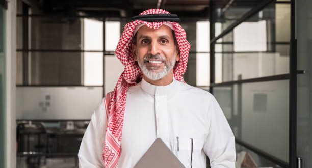 Waist-up front view of mature bearded man in traditional attire standing in modern office with portable information device and smiling at camera.